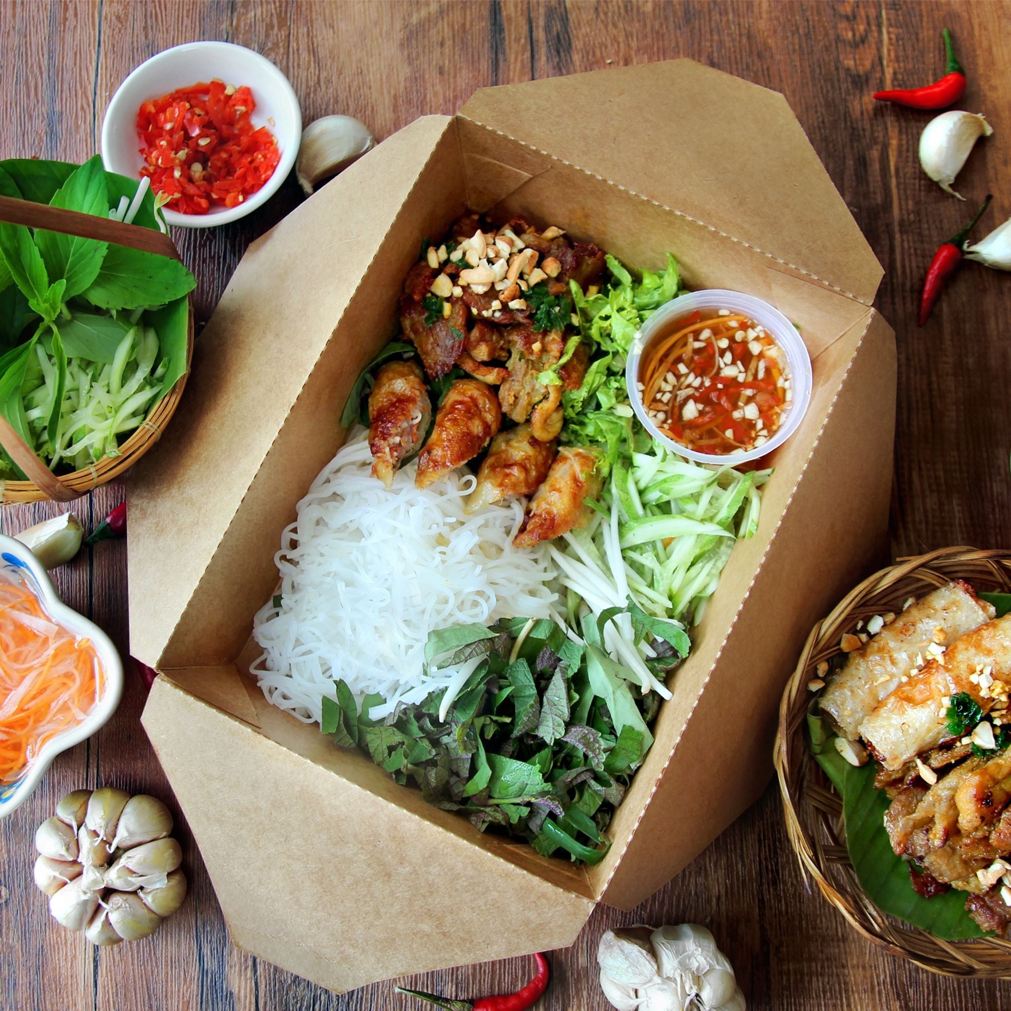 Bún thịt nướng chả giò với thịt ướp sả nướng chín thấm đều gia vị, ăn kèm sợi bún tươi và chả giò giòn rụm. Thêm chút mỡ hành, rau sống và dưa leo băm nhuyễn hòa quyện cùng nước mắm đặc trưng, kết hợp vị béo bùi của đậu phộng rang vô cùng hấp dẫn. Món ăn quen thuộc này là bữa sáng đơn giản nhưng không kém phần dưỡng chất cho cả gia đình.